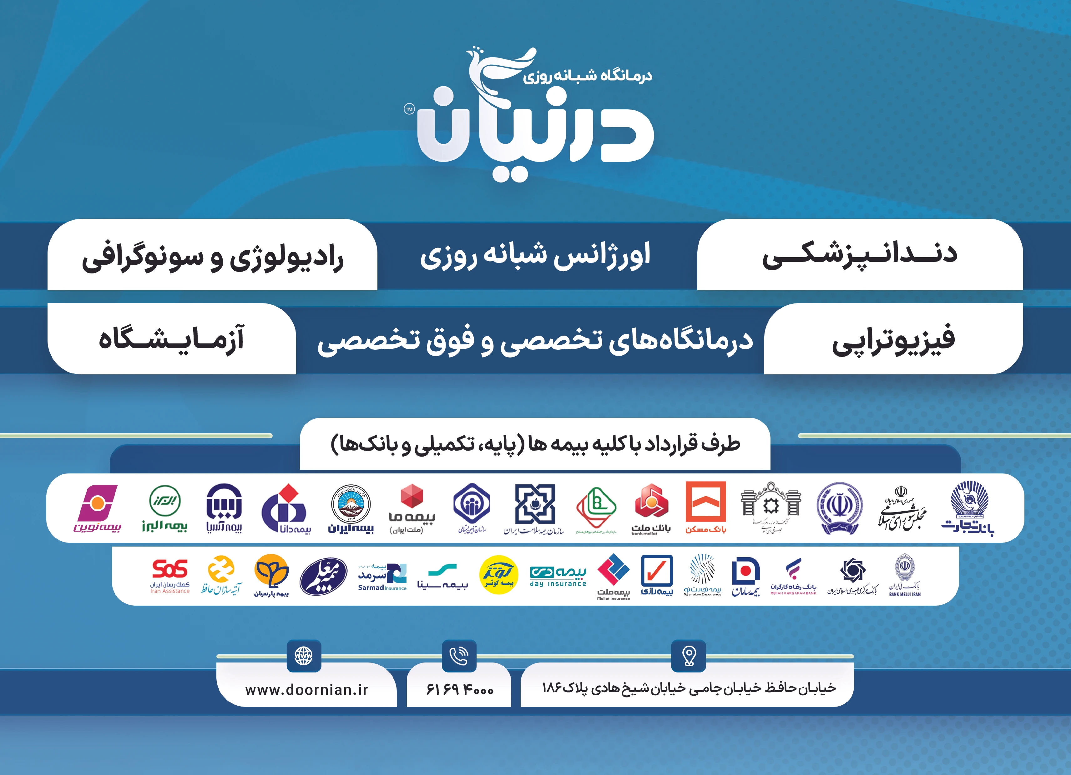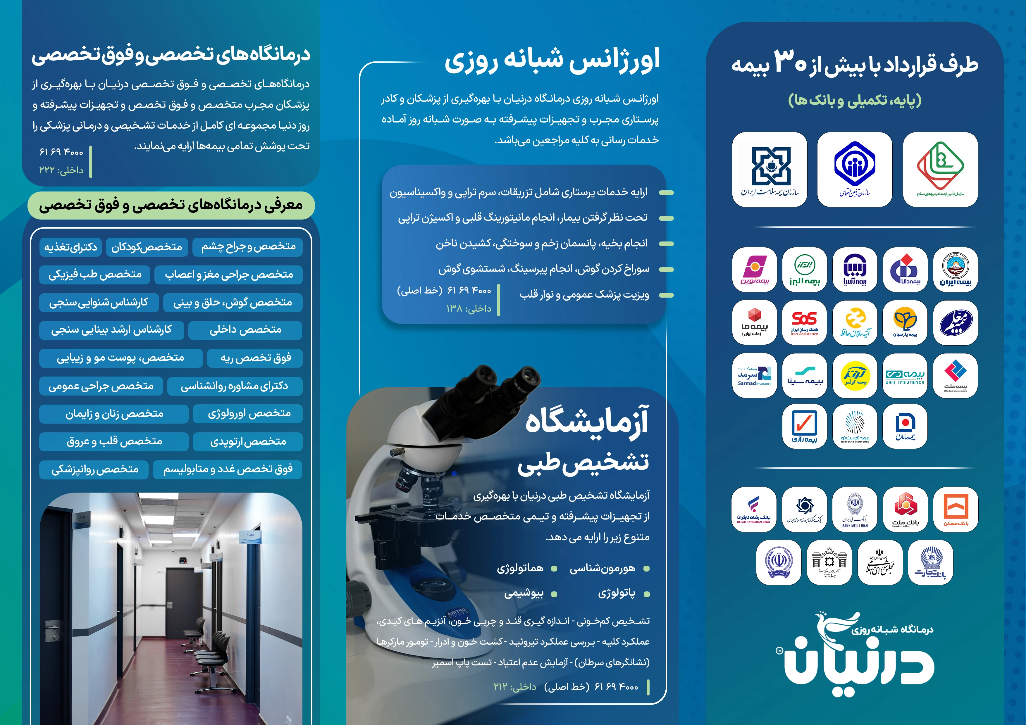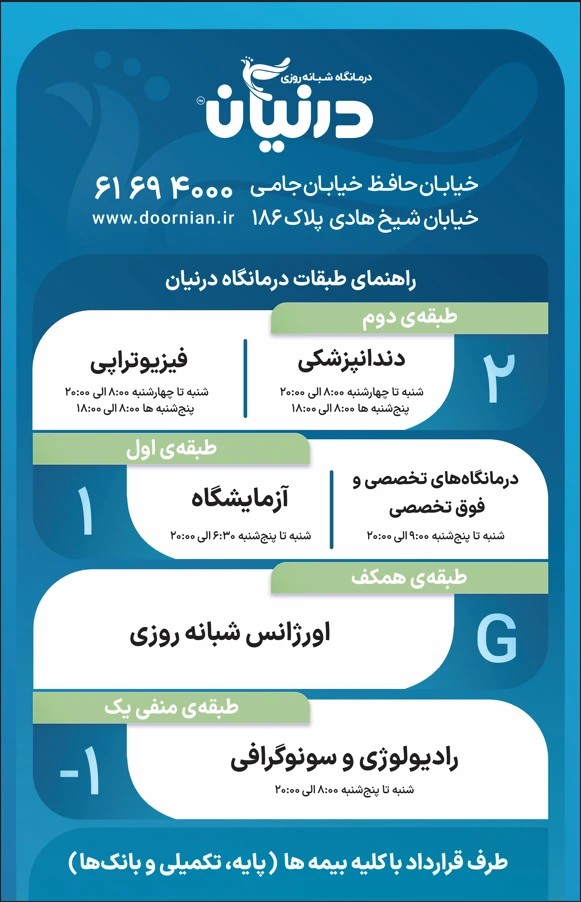 درمانگاه شبانه روزی درنیان در سال ۱۳۹۲ در راستای تشخیص و درمان و ارتقاء سلامت مراجعین منطقه ۱۱ شهر تهران توسط شرکت گروه پزشکی درنیان طب تاسیس و شروع به فعالیت نمود. هدف اصلی موسسین این درمانگاه، ارائه شبانه روزی خدمات تشخیصی، درمانی با بالاترین سطح کیفی می باشد؛ در همین راستا سعی گردیده همواره خدمات، همگام با استانداردهای روز سازمان بهداشت جهانی و وزارت بهداشت در حیطه سلامت بوده و از این رو همواره در حال ارتقاء هر چه بیشتر کیفیت خدمات می باشد. ❇ اورژانس شبانه روزی ❇ آزمایشگاه تشخیص طبی ❇ رادیولوژی و سونوگرافی ❇ دندانپزشکی ❇ فیزیوتراپی ❇ داروخانه شبانه روزی ❇ کلینیک های تخصصی و فوق تخصصی شامل: دکترای تغذیه - فوق تخصص ریه - متخصص داخلی - متخصص جراحی مغز و اعصاب - متخصص طب فیزیکی - متخصص گوش، حلق و بینی - کارشناس شنوایی سنجی - متخصص و جراح چشم - کارشناس ارشد بینایی سنجی - متخصص کودکان - متخصص اورولوژی - دکترای مشاوره روانشناسی - متخصص روانپزشکی - متخصص، پوست مو و زیبایی - متخصص زنان و زایمان - متخصص ارتوپدی - متخصص قلب و عروق - فوق تخصص غدد و متابولیسم - متخصص جراحی عمومی - کارشناس زخم